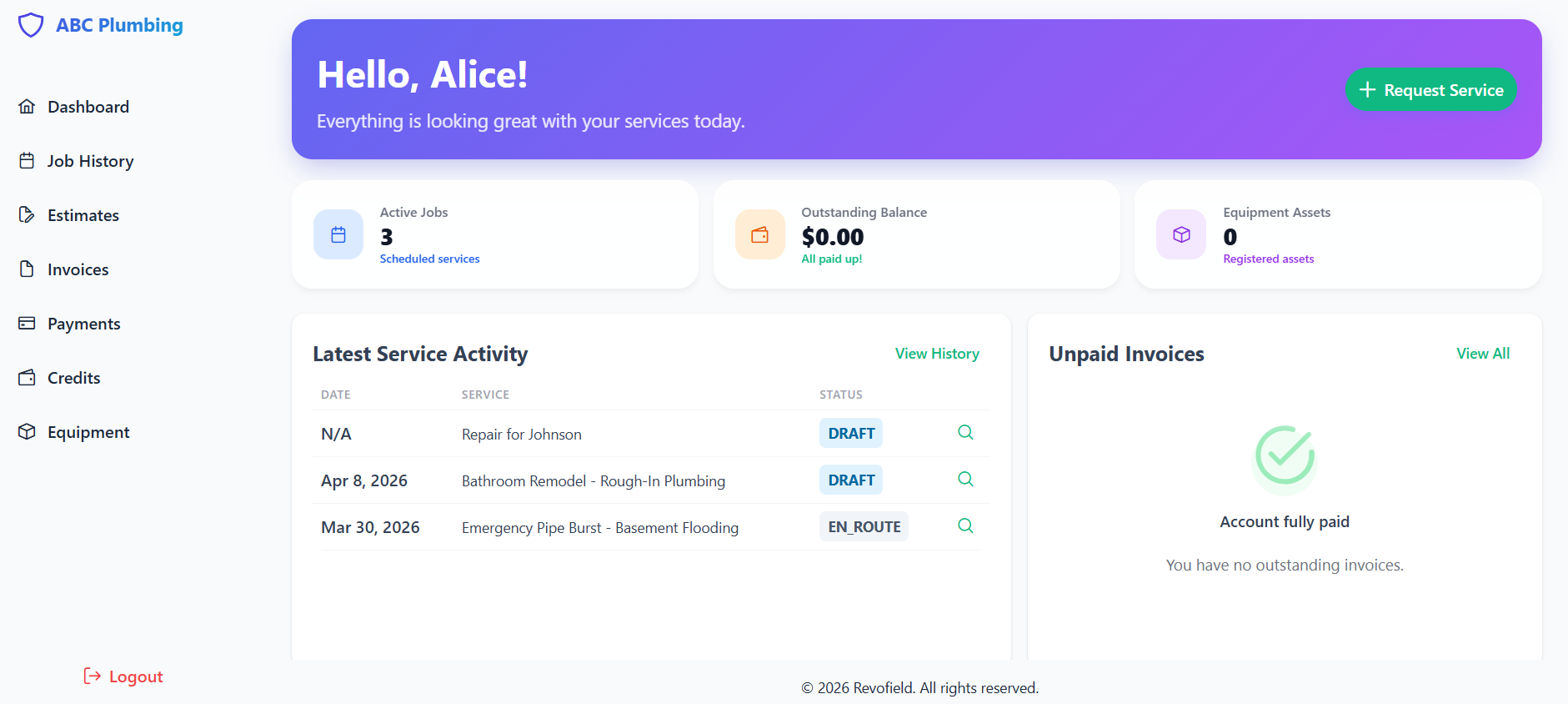 Revofield includes a self-service portal where your customers can view their job history and invoices online — without needing to call or email your office.