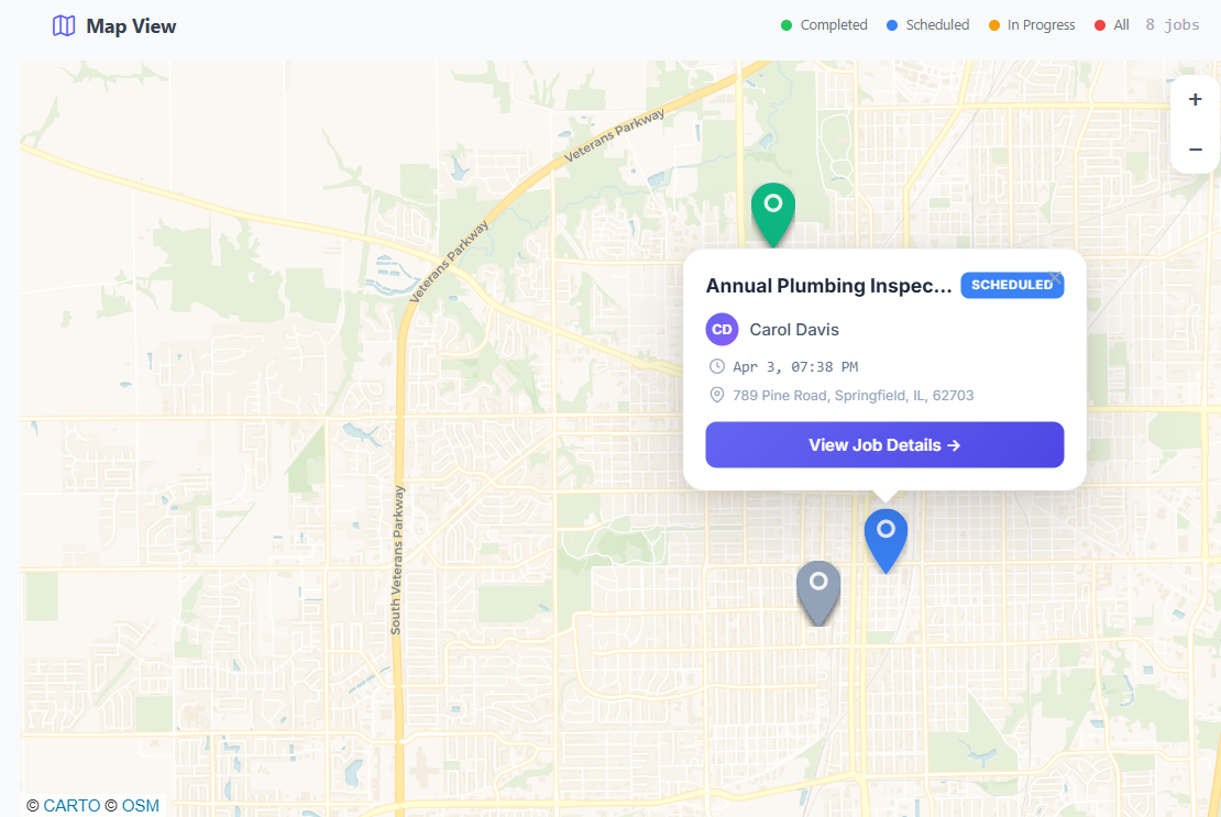 Click a pin to see the job title, customer name, scheduled time, and address. From there, you can navigate to the full job details.