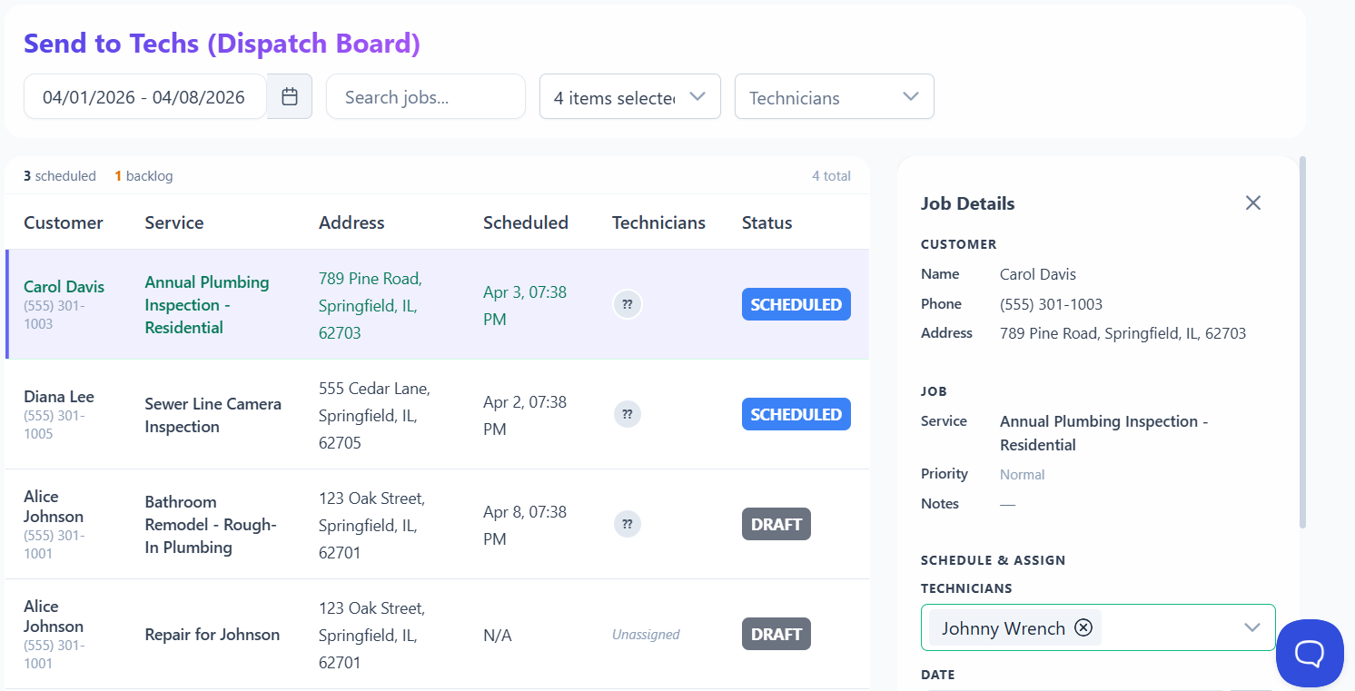 Dispatching — or "Send to Tech" — is how you notify a technician that a job is ready for them. Once a job is scheduled with a date and technician assigned, it can be sent to the tech.
